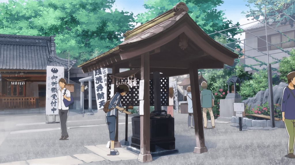 This is where you can see Kotarou clean his hands and rinse his mouth. Apparently the way you’re supposed to do it is far more extensive, but the general public don’t bother with it.