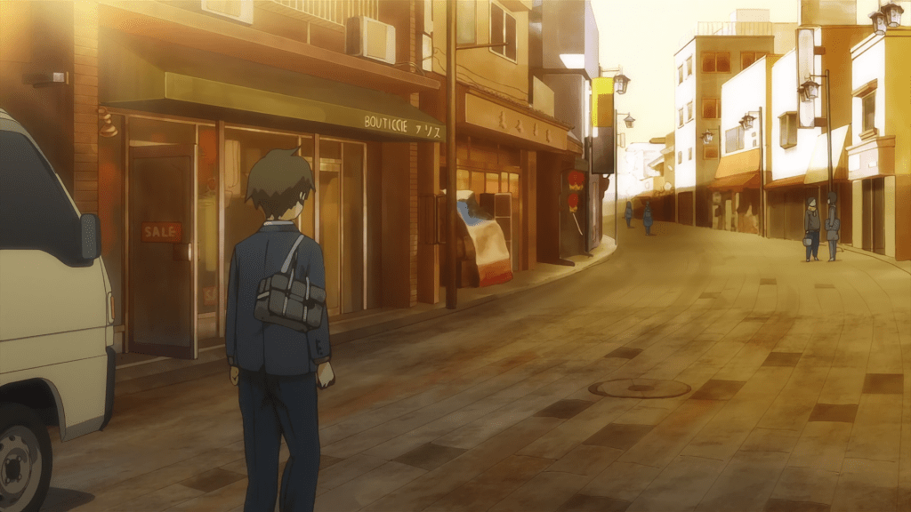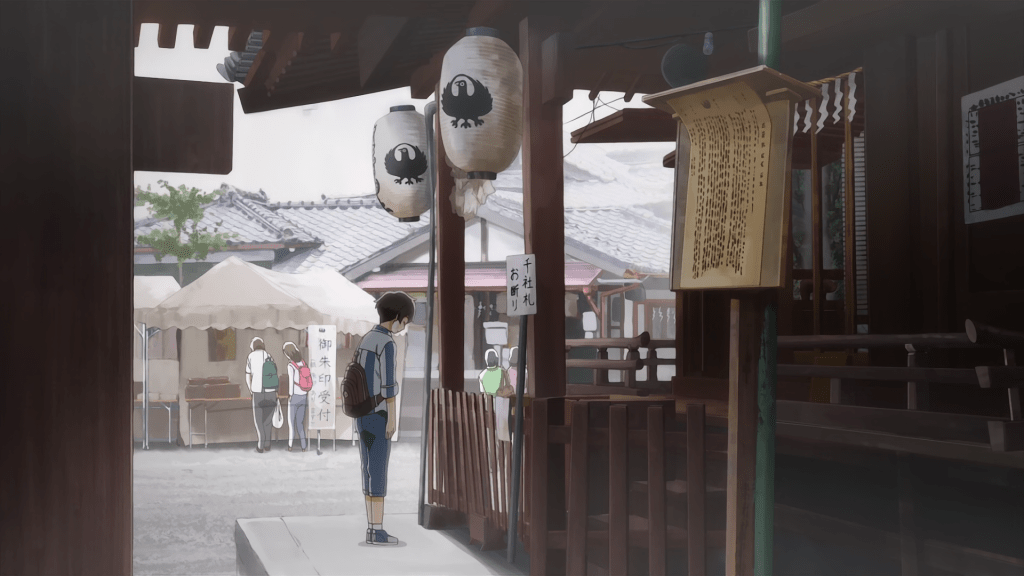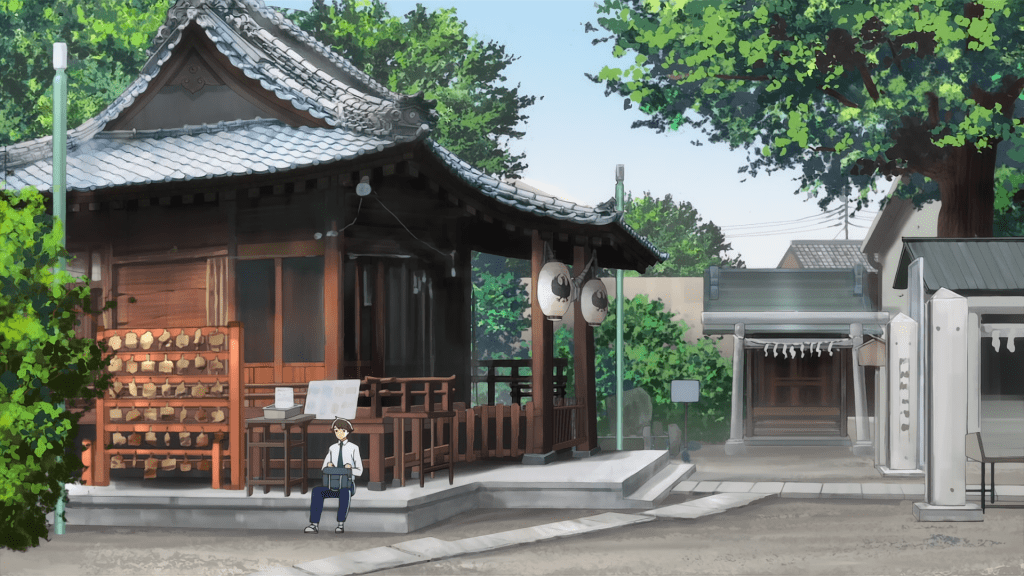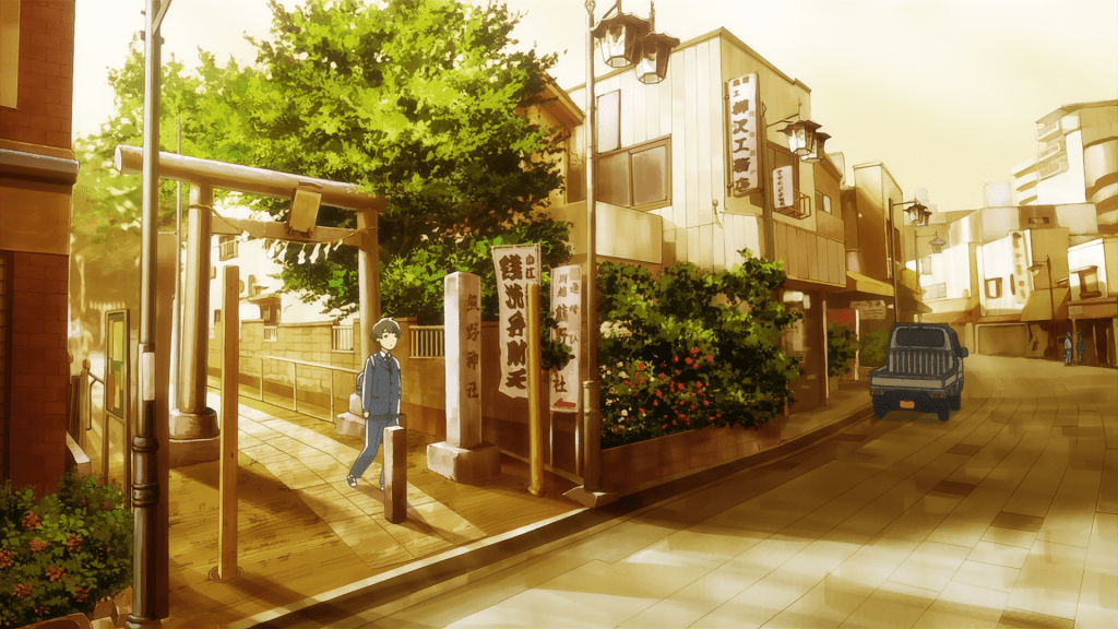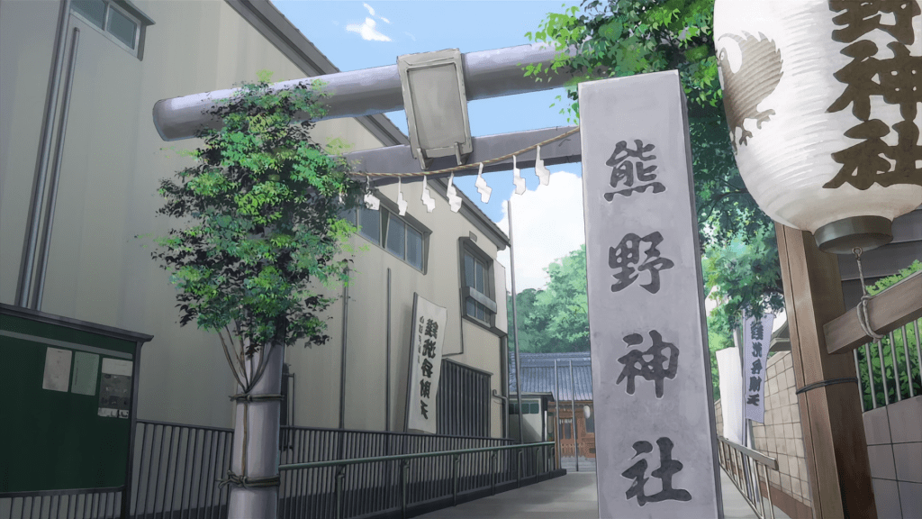 Just outside of the shrine entrance up the road is where Kotarou walks to go to the book shop.