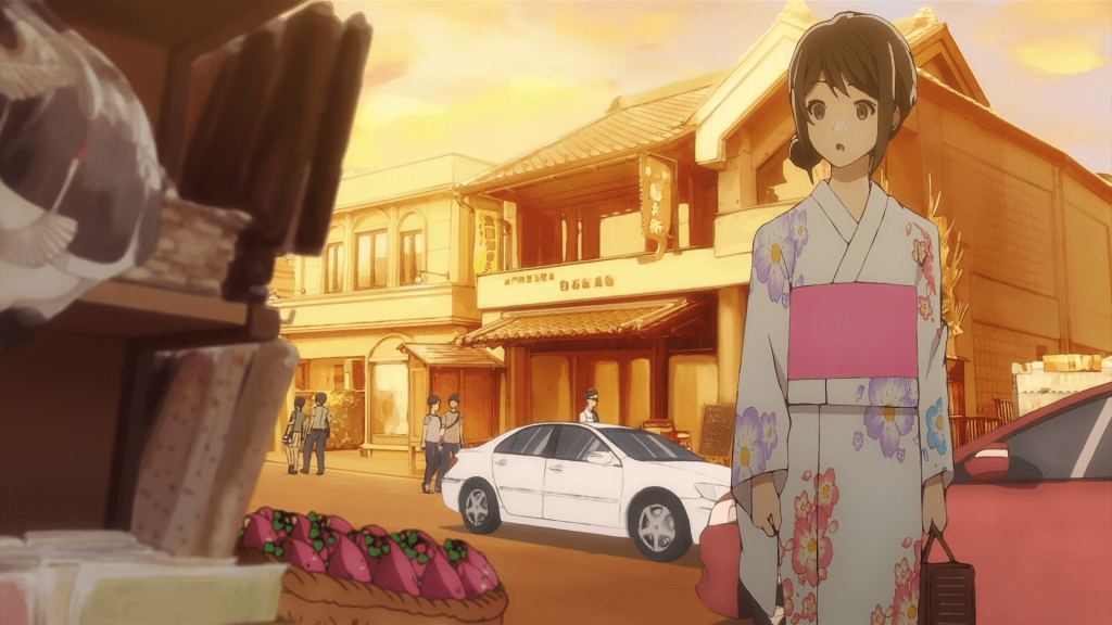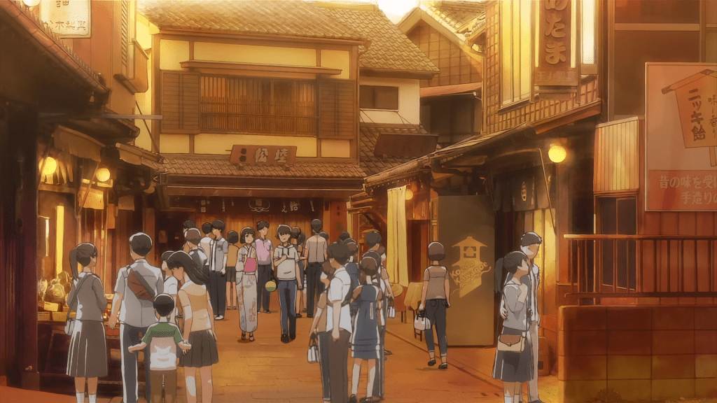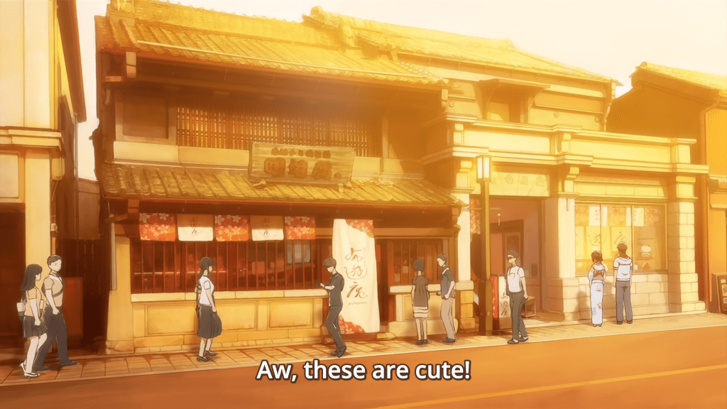 Pretty much right next to that shot is the Souvenir shop, where Akane buys Kotarou a matching sweet potato mascot as a late birthday present on their date in episode 8. Saying I was disappointed that there weren’t any for sale would be an understatement.