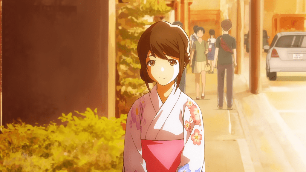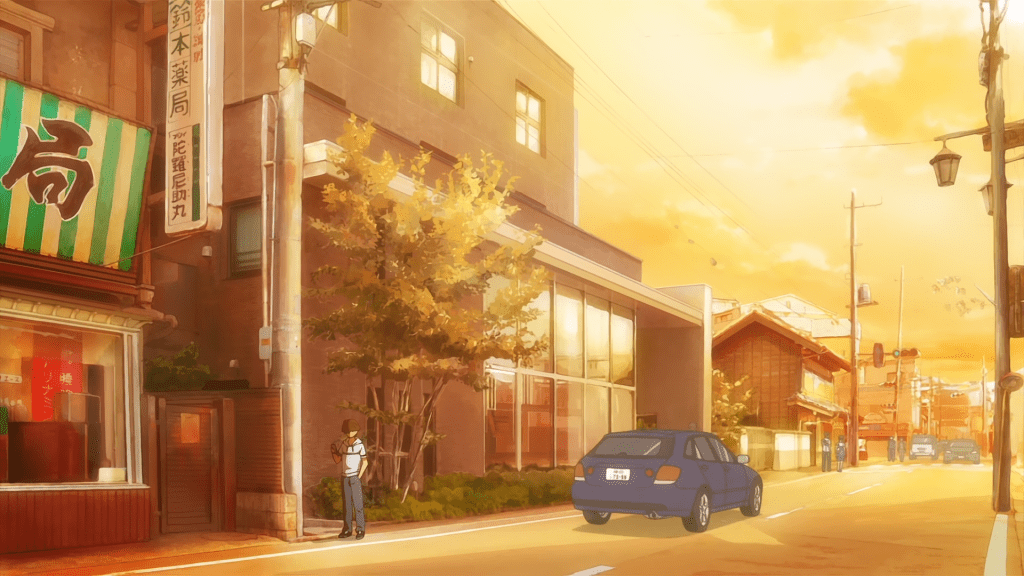 Following this road north it took me directly to the pharmacy, where Kotarou and Akane, wearing a yukata meet for their date in episode 8.