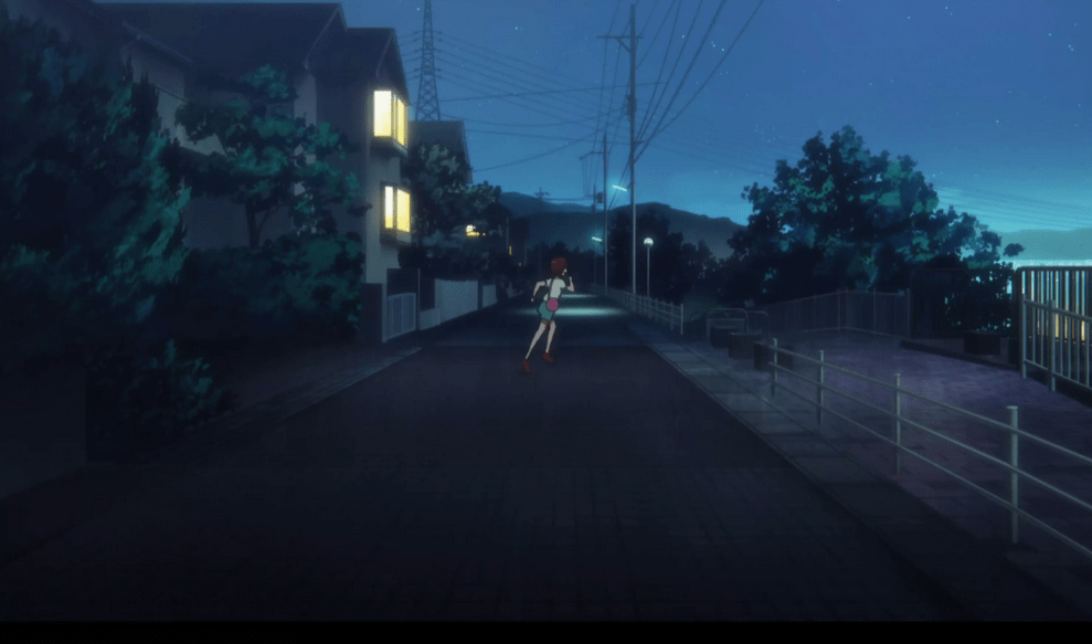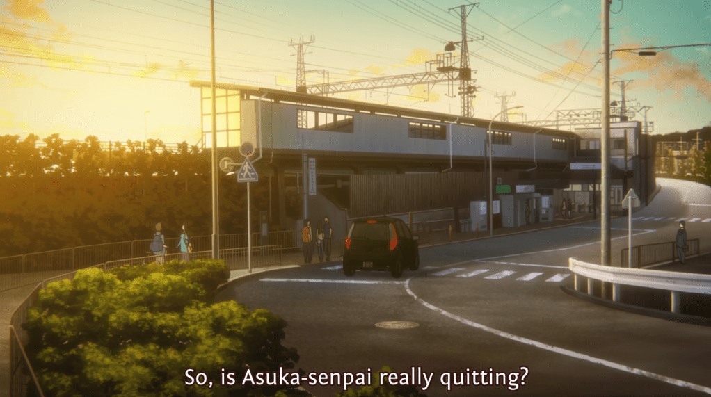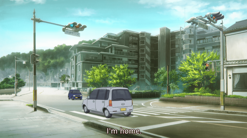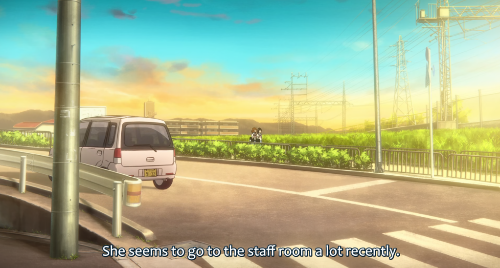 And one looking down the road. On the left you can see the netting for the sports pitch where Taki makes his students do laps before playing their instruments. It’s really mapped 1-to-1 in the show.