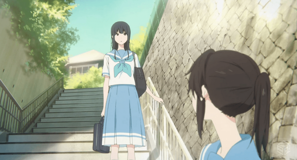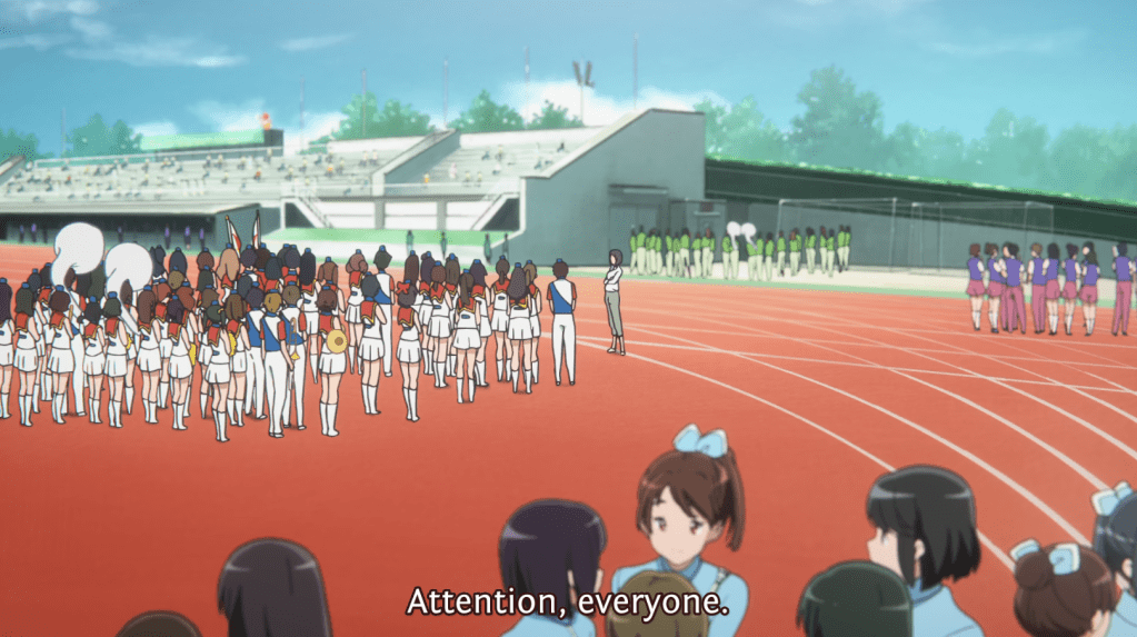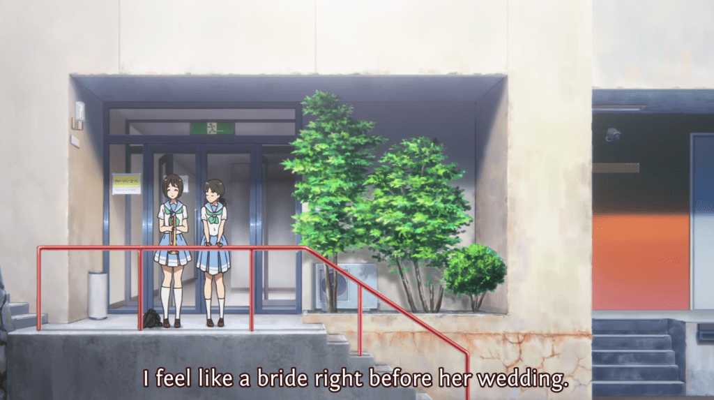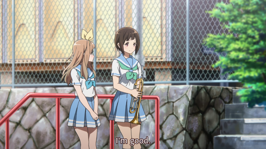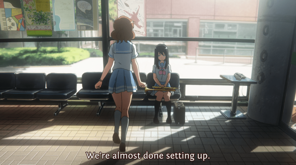 Kumiko and Reina have a pep talk of their own back round by the entrance, to the right of the front doors.