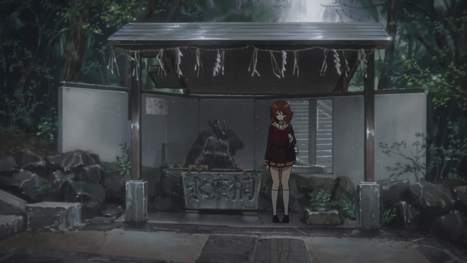 Heading into the shrine, just past the entrance is where Kumiko briefly stops to shelter from the rain at one point.