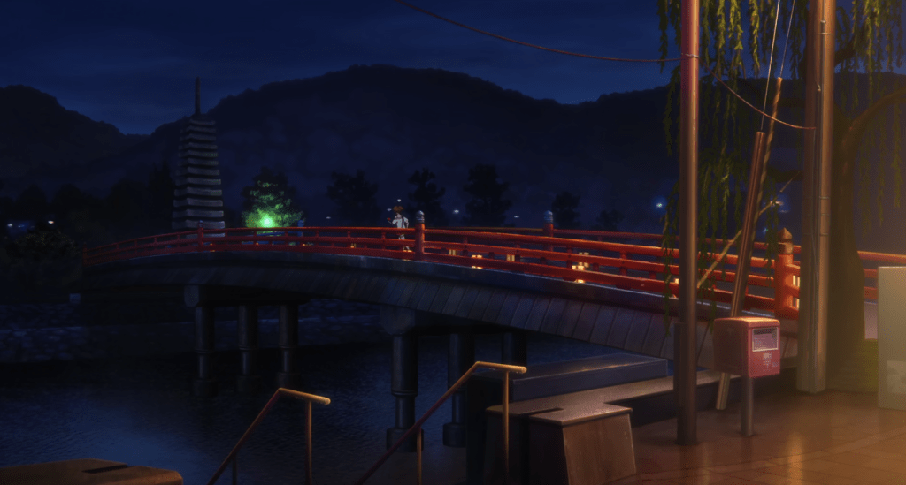 There’s an island next to central Uji surrounded by the Uji river, and the bridge linking the island to the east bank and the surrounding area is featured a lot in the anime.