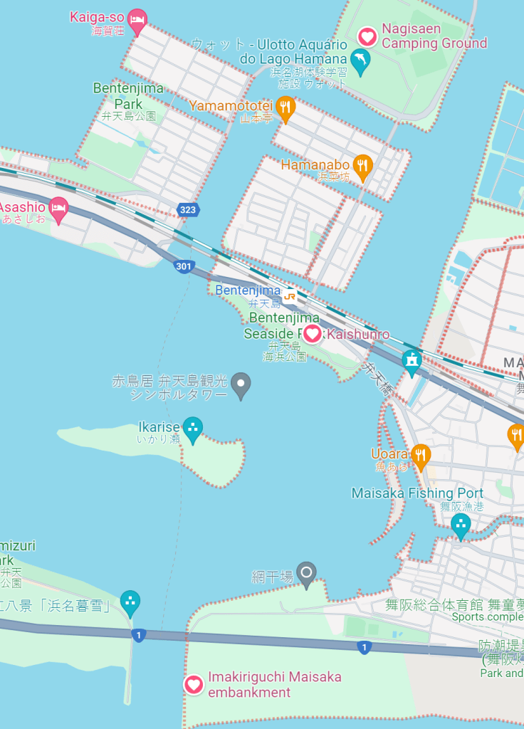 The bridge looming over the area is “Hamana Bridge” which carries what looks like the large expressway “1” linking Hamamatsu to its neighbouring cities.