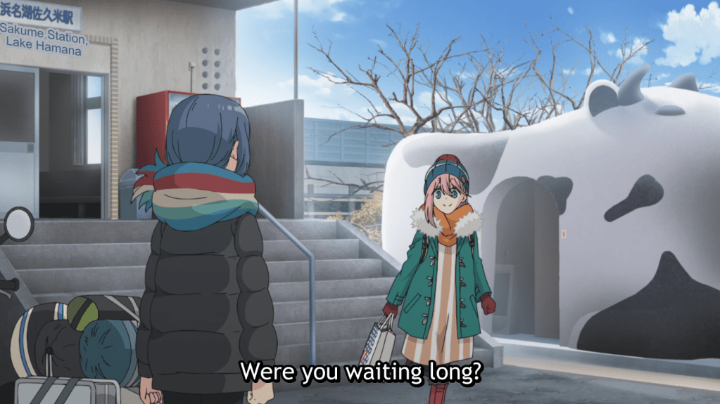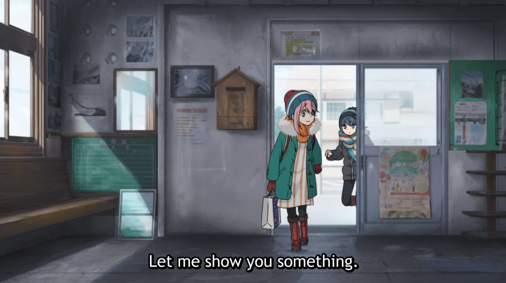 Heading to the tiny station waiting area/entrance, I was greeted with a large Yuru Camp pinup!
