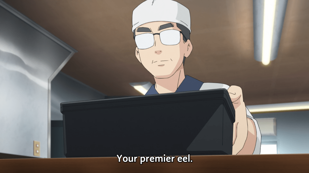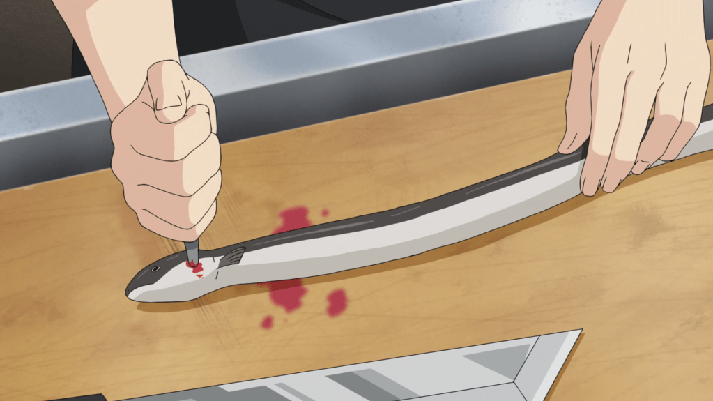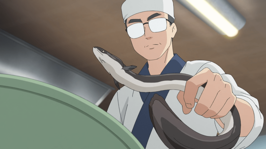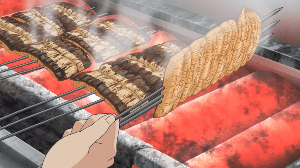 Then the eel was sliced up and attached to skewers, where it was brought over to the right and grilled. Who I presume is the chefs son, was also modelled in the anime!