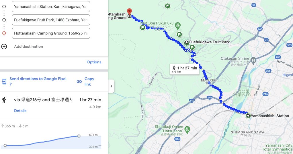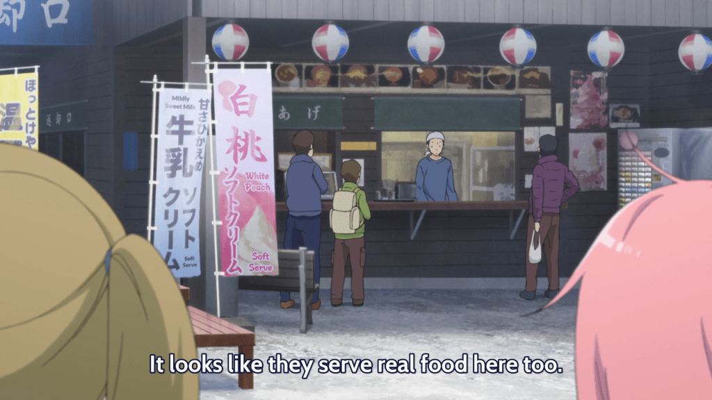 We’d pass by the fruit park and stop for an ice cream and some anime pics, then head on up to the campsite next to the onsen that they visit in the anime too (all from episode 4 and 5 of season 1). Note that this isn’t the same campsite featured in the anime, which is pine wood. It has an owner with a bit of a negative reputation, and the way the site is managed is a bit old fashioned. I didn’t want to risk it (I’d been shouted at by that owner in the past before too lol) so we decided to opt for the Hottarakashi site instead.