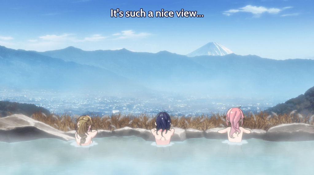 After that, we all headed down to the onsen together to have a bathe. I couldn’t record inside for obvious reasons, but it was just like in the anime. Nice and relaxing, and with a gorgeous view.