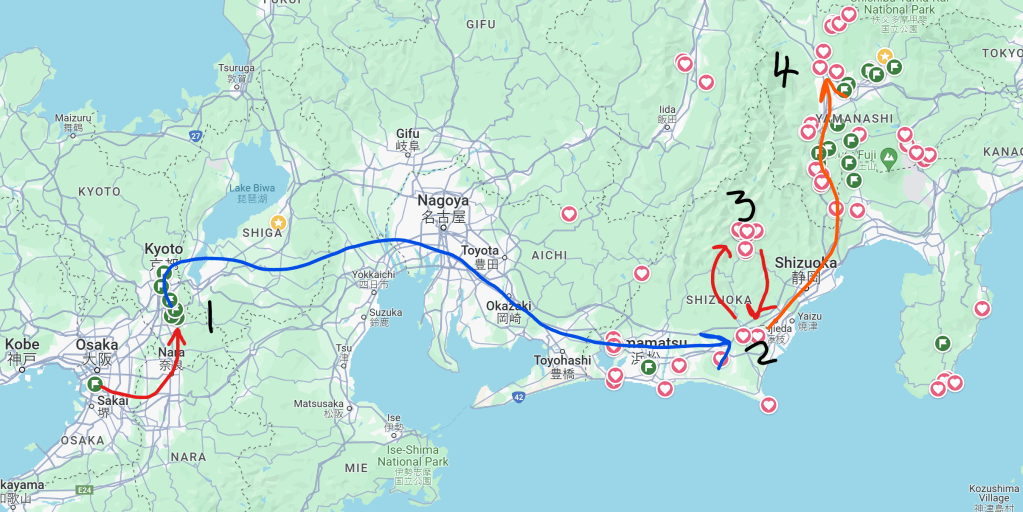 I had a great time in Osaka meeting tons of new people and being social for a week. But now my social battery is all depleted, it’s time to go solo again. In Osaka, I planned to finish up season 3 of Hibike Euphonium before heading over to Uji (1 in the image below) for a night (where it takes place).Then I’d take the shinkansen from Kyoto all the way to Shimada and start my Season 3 Yuru Camping (2, 3, 4). Then when I’m done with all that I’ll head back to Tokyo for a few days before flying home. More on the Yuru Camping later, this post is just about Eupho and Uji.