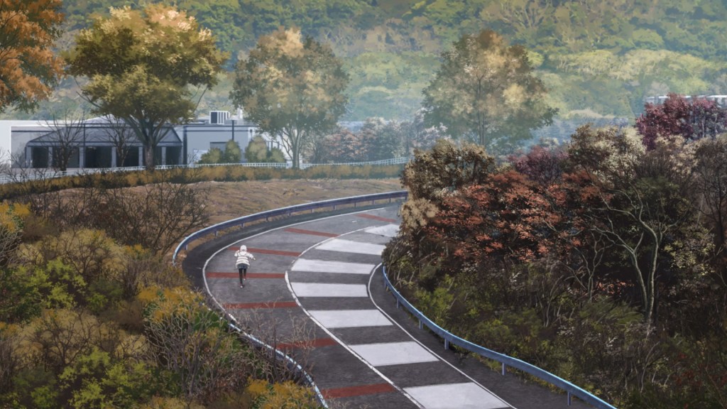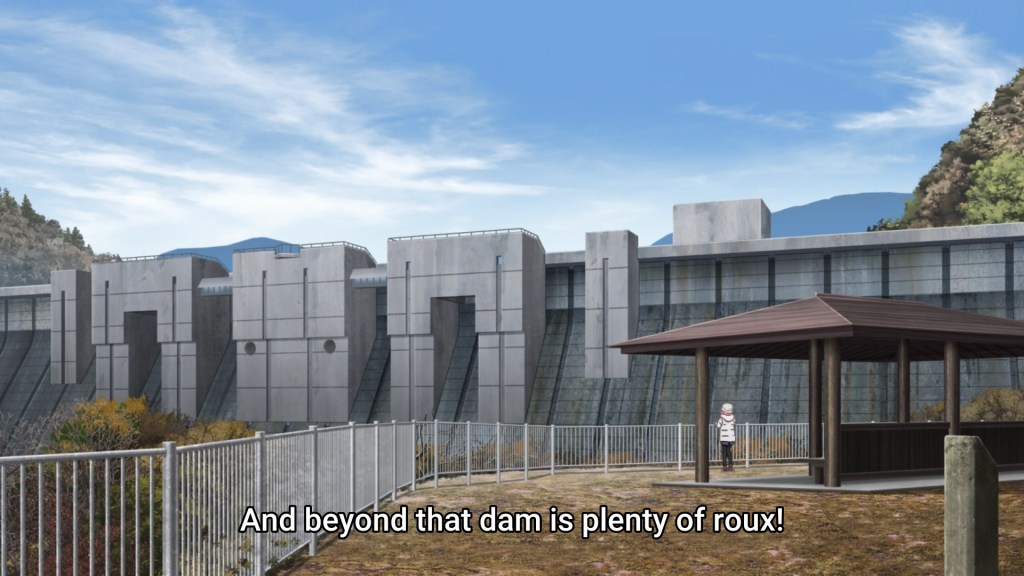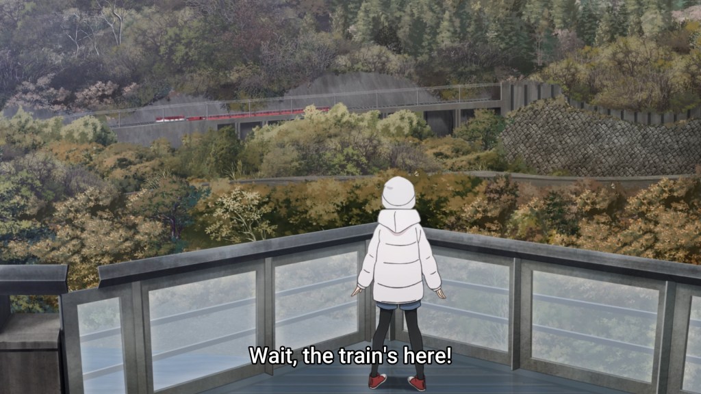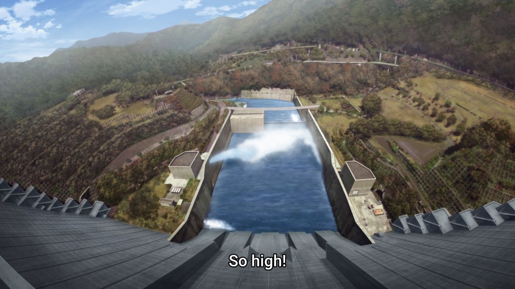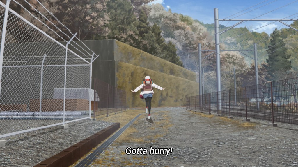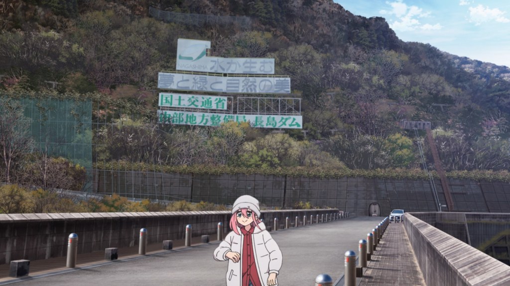 Just before Nadeshiko keeps going she stops and has a look at the suspension bridge next to the railroad crossing. Again, I didn’t have any means of capturing an FOV this wide, so I tried my best.